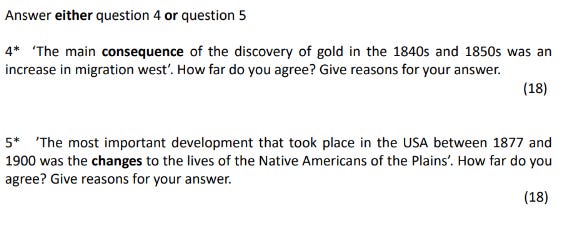 Similarly for the Making of America paper I chose these two essay questions because I want to check their understanding of Enquiry 5 (American Cultures 1877 to 1900) because they often don’t revise this properly (Question 5). I also chose Question 4 because again it’s a question that needs careful decoding and I know that not decoding questions properly is a key reason for students underperforming - so I need to see who needs more support with this.