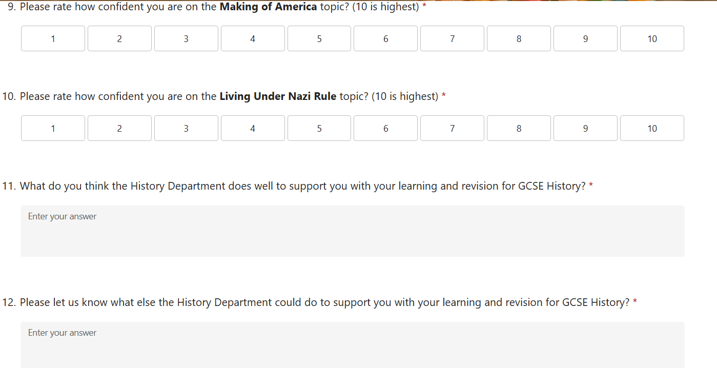 From here I also do a Forms Survey so that students can give feedback on the mock process and also give feedback on what they think they need to work on between now and the final GCSEs. This helps me shape the revision period for students and for me to gauge which topics students feel more or less confident on and what revision strategies they are finding useful.