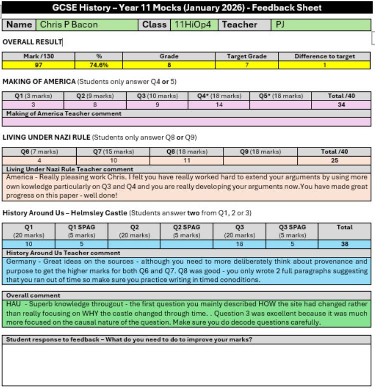 Year on Year my students complain to me that they can’t read my writing. It also struck me that when I write my valuable feedback on paper and give it to the students that knowledge and precise target I’ve given students is often lost to me. Such is the value of feedback to something like a mock that I need to be able to have my precise thoughts at my fingertips. This year I inputted all marked and comments for each paper onto a spreadsheet and then used MailMerge to put it onto a word document. This enabled me to create a typed up feedback sheet but one that crucially I could retain a digital copy of. The feedback not only looked better but also was much more readable for students. Here is an example and I can confirm for GDPR reasons that this is not a real student but if they were they would make a fantastic breakfast!