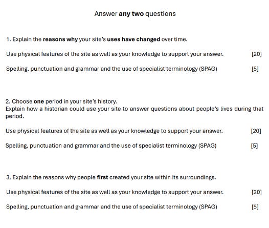 I chose Question 1 because being able to write confidently about change is a key aspect of the History Around Us course but also I want to test whether they have taken on board the advice of decoding questions as a very common pitfall on this question is to ignore the causal element and simply describe how the site has changed through time. I need to check which students might have a tendency to do this. I also want to check that they know to write about the English Civil War when writing about change for our site which is Helmsley Castle.