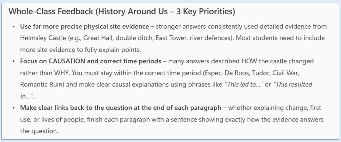 I was also able to look at the data in Excel and analyse my own written comments on a whole class level in order to generate some whole class feedback using CoPilot. This was incredibly useful to crystallise thinking and look for patterns in my own comments. Although some of this was not a total surprise it was still another useful way to think about Whole Class Feedback. Here are the three points it gave me for the History Around Us paper